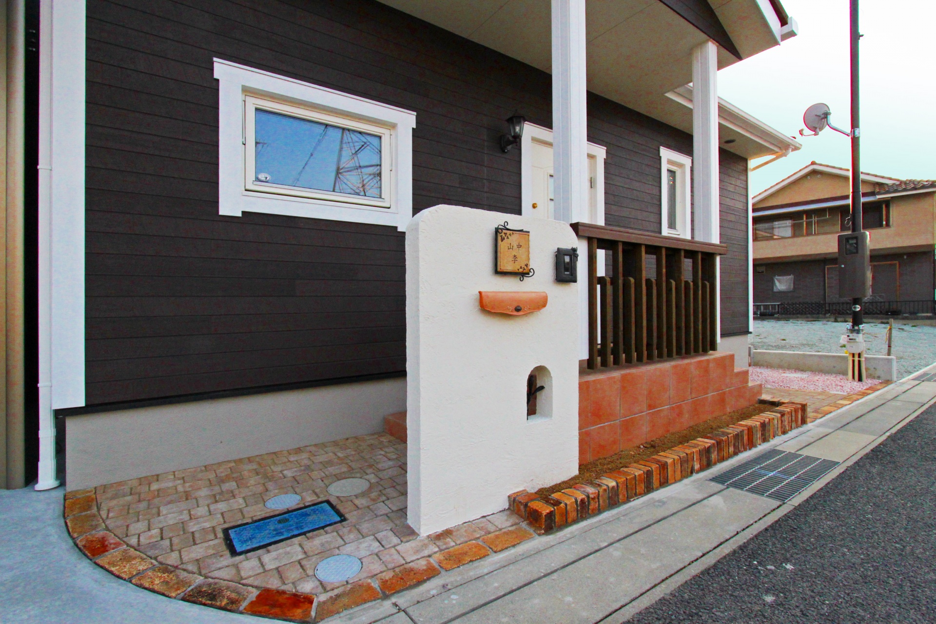 施工事例 カントリー アンティークレンガを生かした、ぬくもりを感じるオープン外構 アンティークレンガを生かした、ぬくもりを感じるオープン外構 お家の雰囲気にぴったりと合うアンティークレンガで縁取られたアプローチ、生活動線に配慮した門柱。 カーポートには柱位置をフレキシブルに配置できる、三協アルミ Uスタイルで、駐車も楽々です。 お庭スペースにも圧迫感を与えることなくスッキリと納まりました。